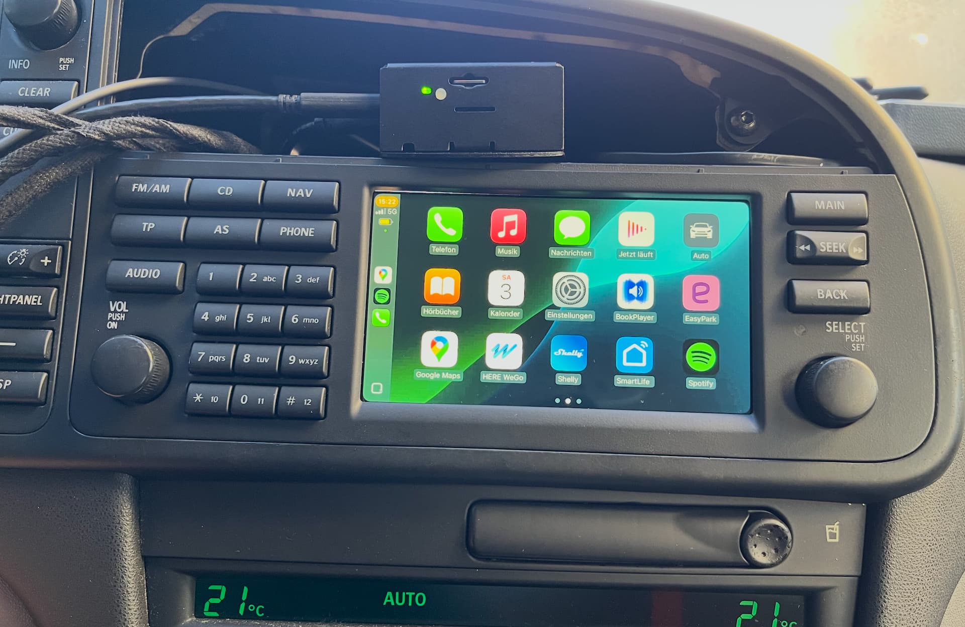 The original screen has been replaced by a new touch screen, the LED-Backlight behaves more or less like the original one (dimming might be slightly different). The RPI is running react carplay and gets powered by the PiMost. I currently have no sound via CarPlay (I would have to switch to PiMost manually) because “standalone mode” is not yet ready for my 3-amplifier setup, and we haven’t started our own implementation yet because we are working on a Vue-based CarPlay/HUD but we haven’t gotten the dongle to work yet. I guess I will buy a cheap sound card for the RPI and use the AUX until we’re ready…
